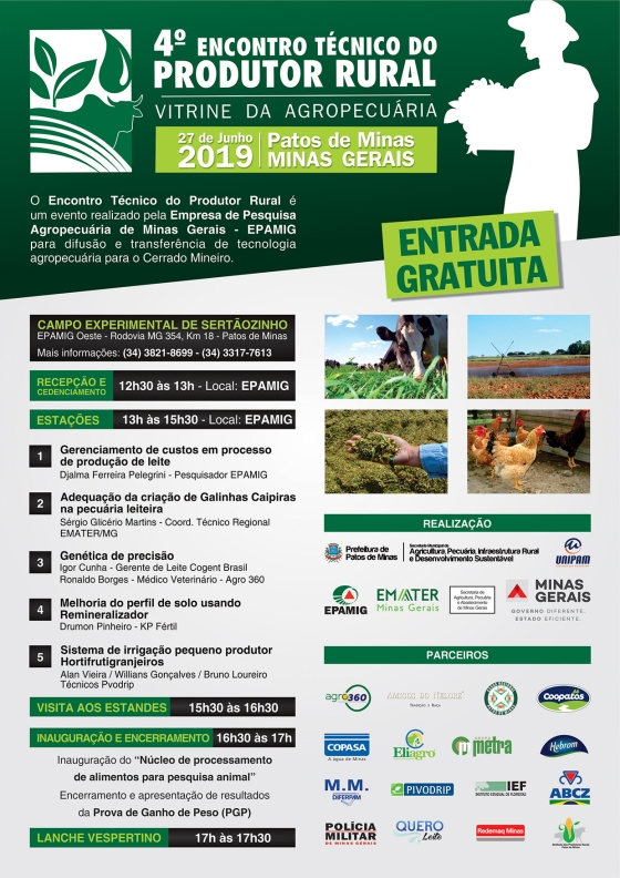 (BELO HORIZONTE, 24/06/2019) - O 4º Encontro Técnico do Produtor Rural será realizado no dia 27 de junho, de 12h30 às 17h30, no Campo Experimental de Sertãozinho da Empresa de Pesquisa Agropecuária de Minas Gerais (Epamig), em Patos de Minas. O evento vai abordar práticas agropecuárias para o cerrado, por meio de temas como adequação da criação de galinhas caipiras na pecuária leiteira, genética de precisão, melhoria do perfil de solo e sistema de irrigação para os pequenos produtores de hortifrutigranjeiros.