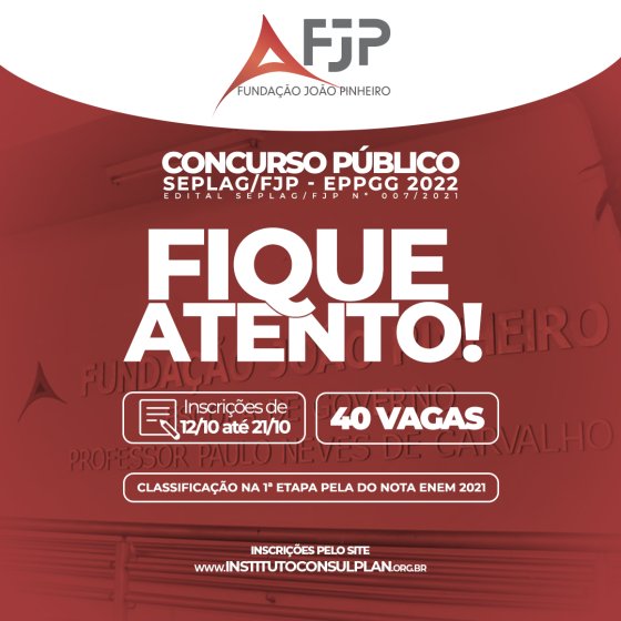 Mais informações no Edital Seplag/FJP nº 007/2021, e-mail atendimento@institutoconsulplan.org.br ou pelo telefone 0800 283 4628.
