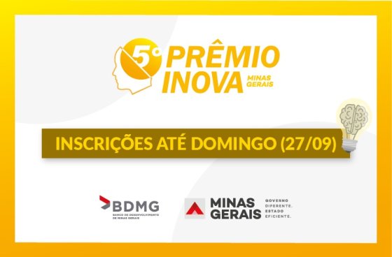 Terminam no próximo domingo (27/9), às 18h, as inscrições para a 5º edição do Prêmio Inova Minas Gerais. Os servidores estaduais podem participar encaminhando ideias inovadoras que aprimorem a gestão governamental, sendo elas já implementadas e com bons resultados, ou com potencial para qualificar a prestação de serviços prestados pelo Estado. Haverá premiação em dinheiro de até R$ 5 mil. Para garantir a inscrição e concorrer aos prêmios, acesse aqui.