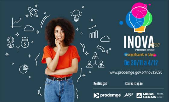 A Prodemge realiza, entre 30/11 e 4/12, a Inova 2020 – 3ª Semana de Inovação, em parceria com a Fundação João Pinheiro (FJP) e as secretarias de Planejamento e Gestão (Seplag), Desenvolvimento Econômico (Sede) e Fazenda (SEF). O evento é gratuito e aberto à participação do público. Devido à pandemia, a programação será totalmente on-line e pode ser conferida em www.prodemge.gov.br/inova2020.