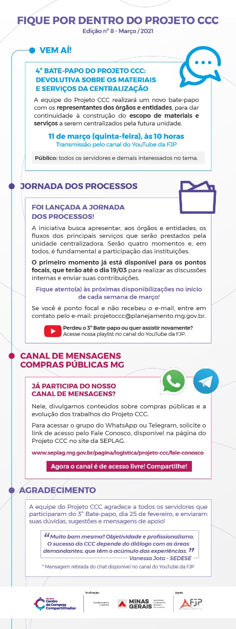 Revista do Conselho Nacional de Secretários de Estado de Administração (CONSAD), Nº 28, 02/2020: “Minas quer economizar com uma unidade para compras compartilhadas: em fase de implantação, CCC vai centralizar as demandas do governo do estado a partir de 2021 e reduzir gastos em escala”, página 72.